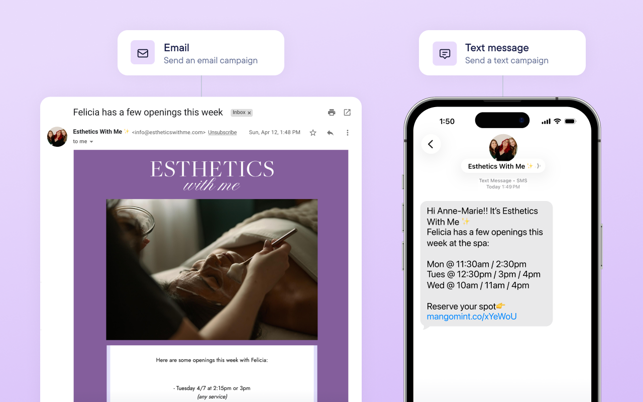 Shannon’s team also uses campaigns every month to send one-time messages to their clients. With Mangomint’s filtering capabilities, they’re able to fill last-minute openings by targeting specific clients based on certain criteria like appointment history, membership status, and other client tags. Pre-made templates and personalized texts with emojis and images make each message feel on-brand and unique to Esthetics With Me.