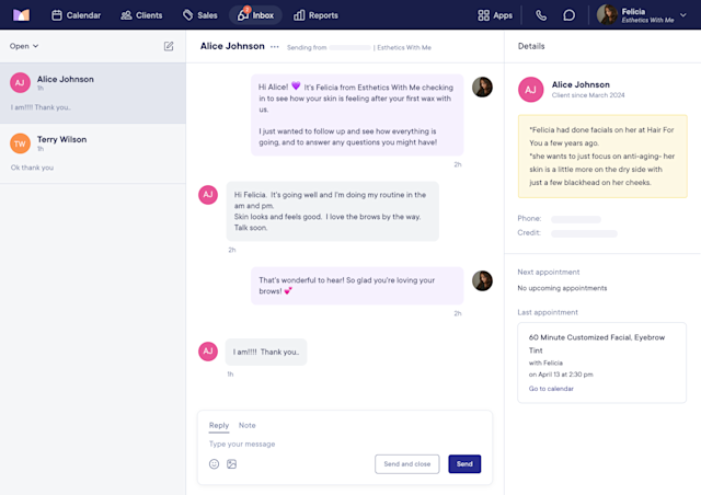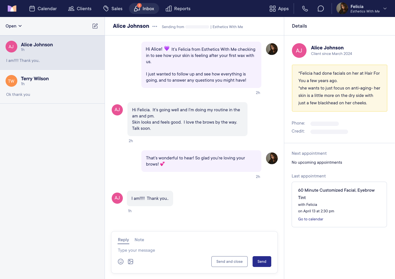 The feature that changed her daily to-dos the most was Connect, Mangomint’s centralized client communication suite. Now, all of her employees can make and receive phone calls, text with clients, and chat online with website visitors, all from the Mangomint app. They can add confidential notes to different conversations and quickly scan a client’s entire communication history from one organized inbox.