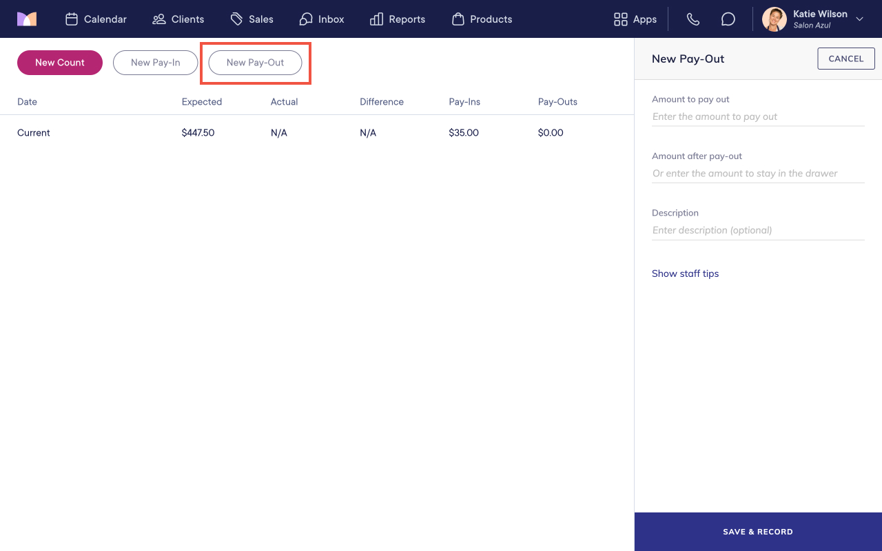 To remove money from the cash drawer, open the Cash Drawer app and select New Pay-Out.
