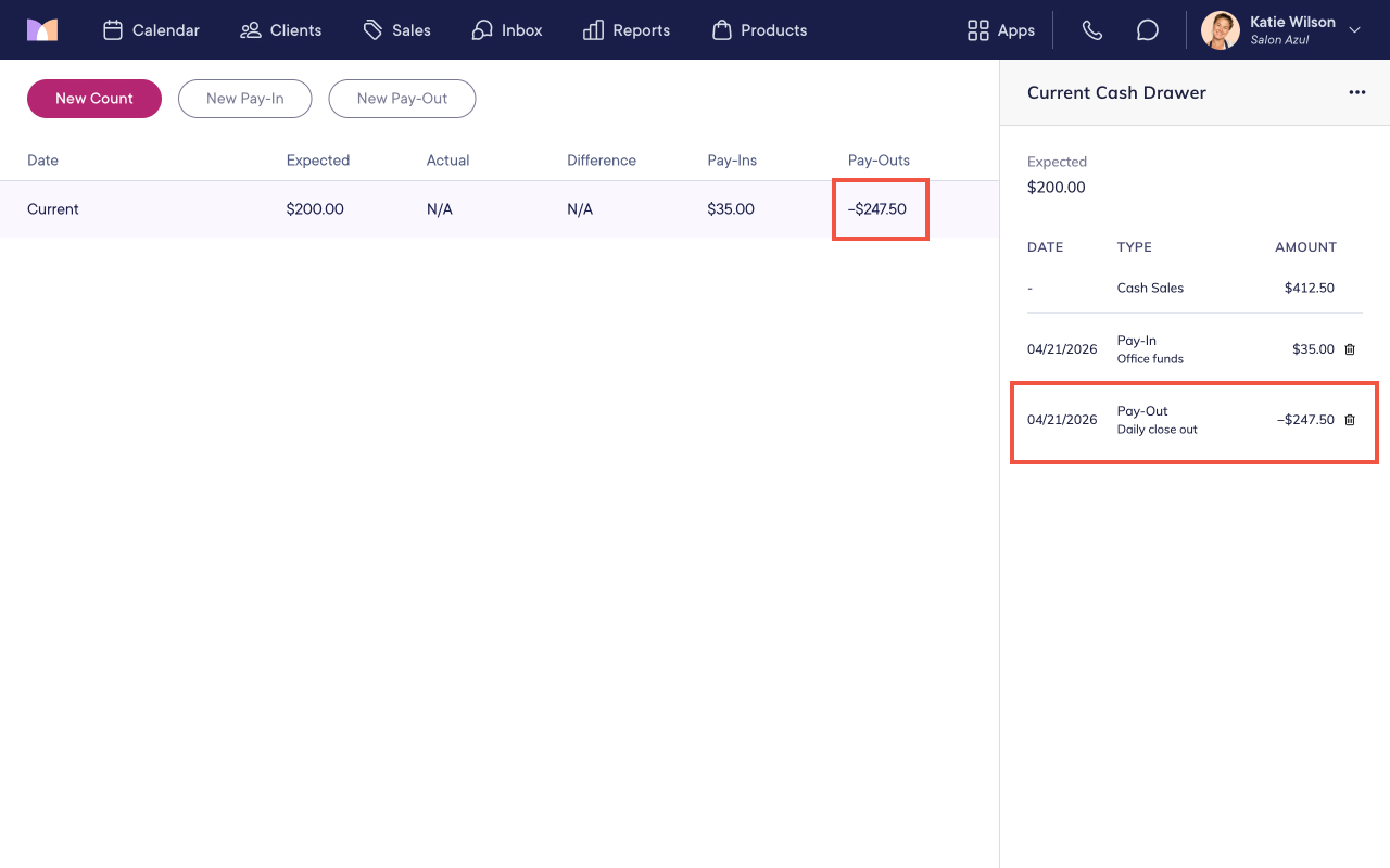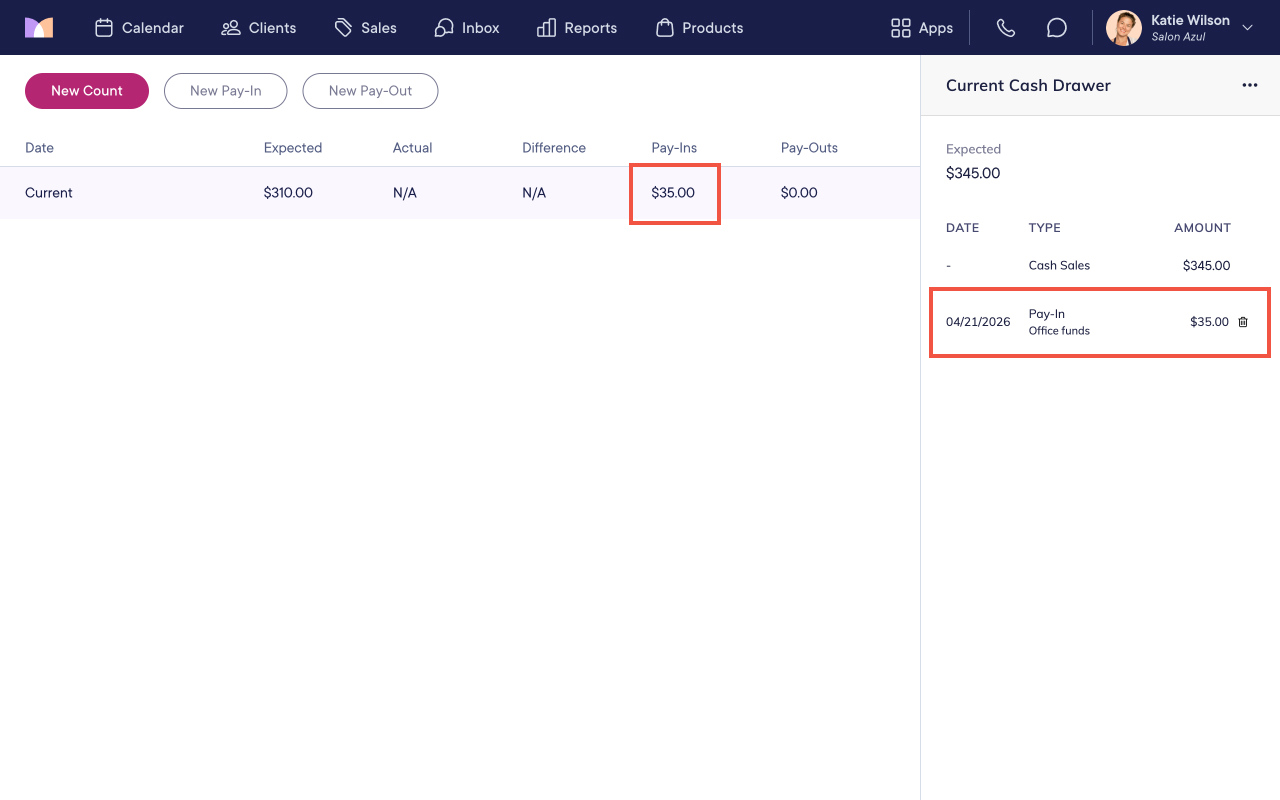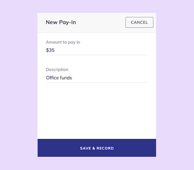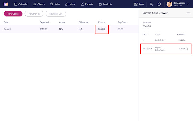 Pay-ins allow you to add money to the cash drawer, and pay-outs allow you to take money out of the cash drawer. For example, you may need to take out cash to buy office supplies. Afterward, if you have change left, you may want to add the change back to the cash drawer.