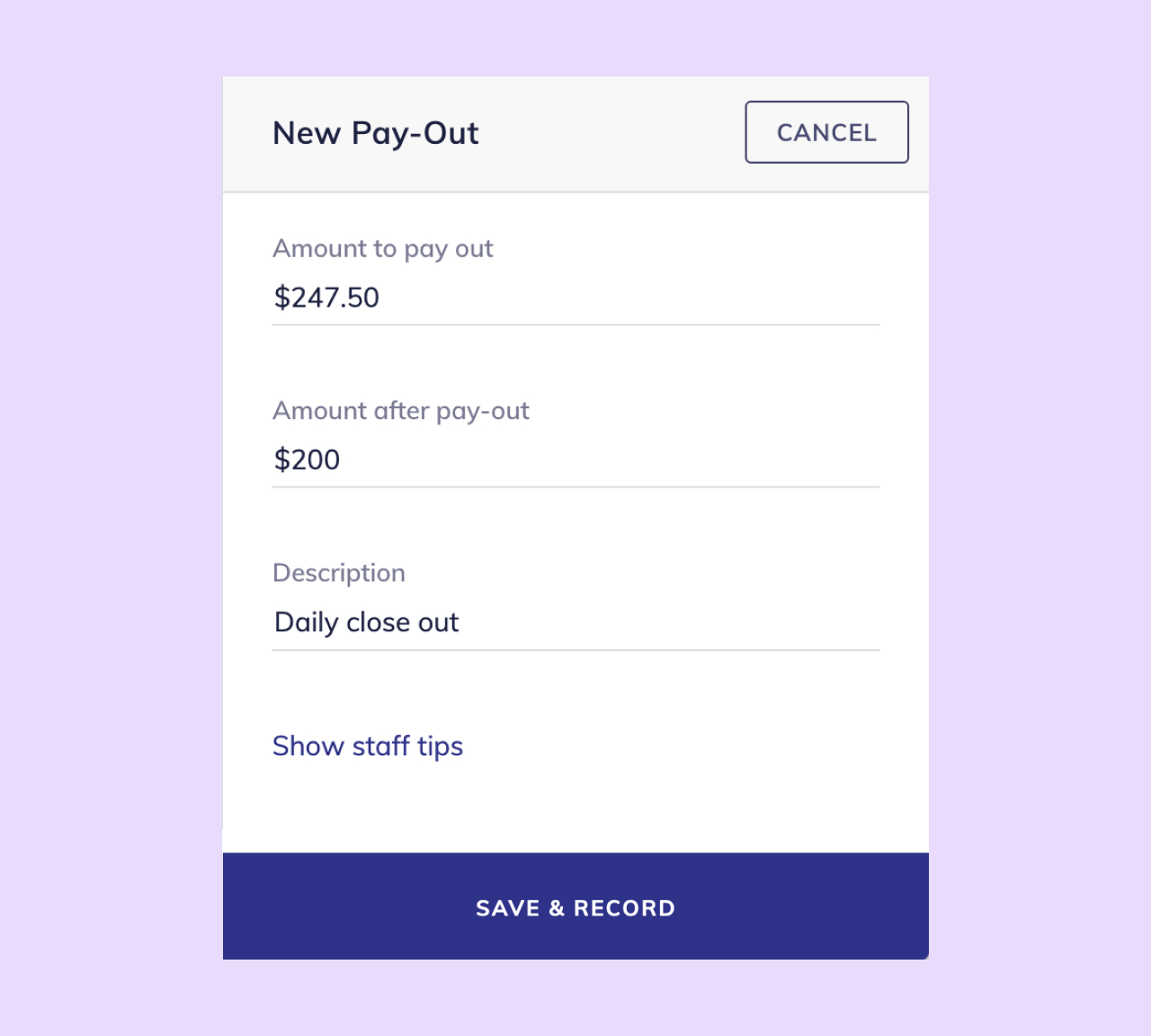 Pay-outs are used to perform daily closeouts. You can also use pay-outs to pay your staff members cash tips.
