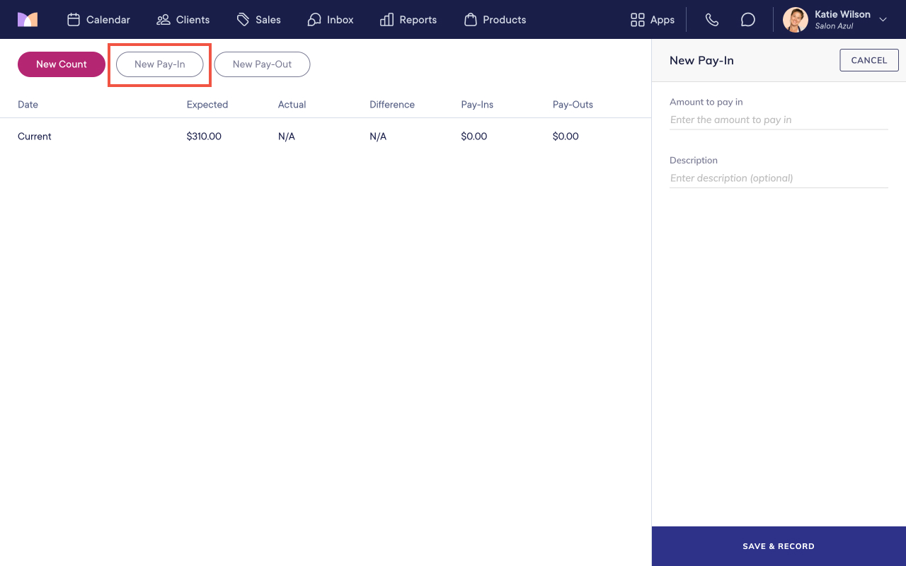To add money to the cash drawer, open the Cash Drawer app and select New Pay-In.