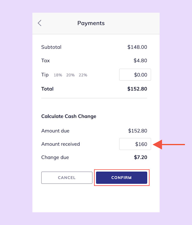 Enter the amount of cash provided by the client in the Amount received field. If the change calculator is enabled, the change will be automatically calculated for you. To enable the change calculator, open the Settings app and go to Payments & Checkout > Advanced Settings > Change Calculator for Cash Payments.