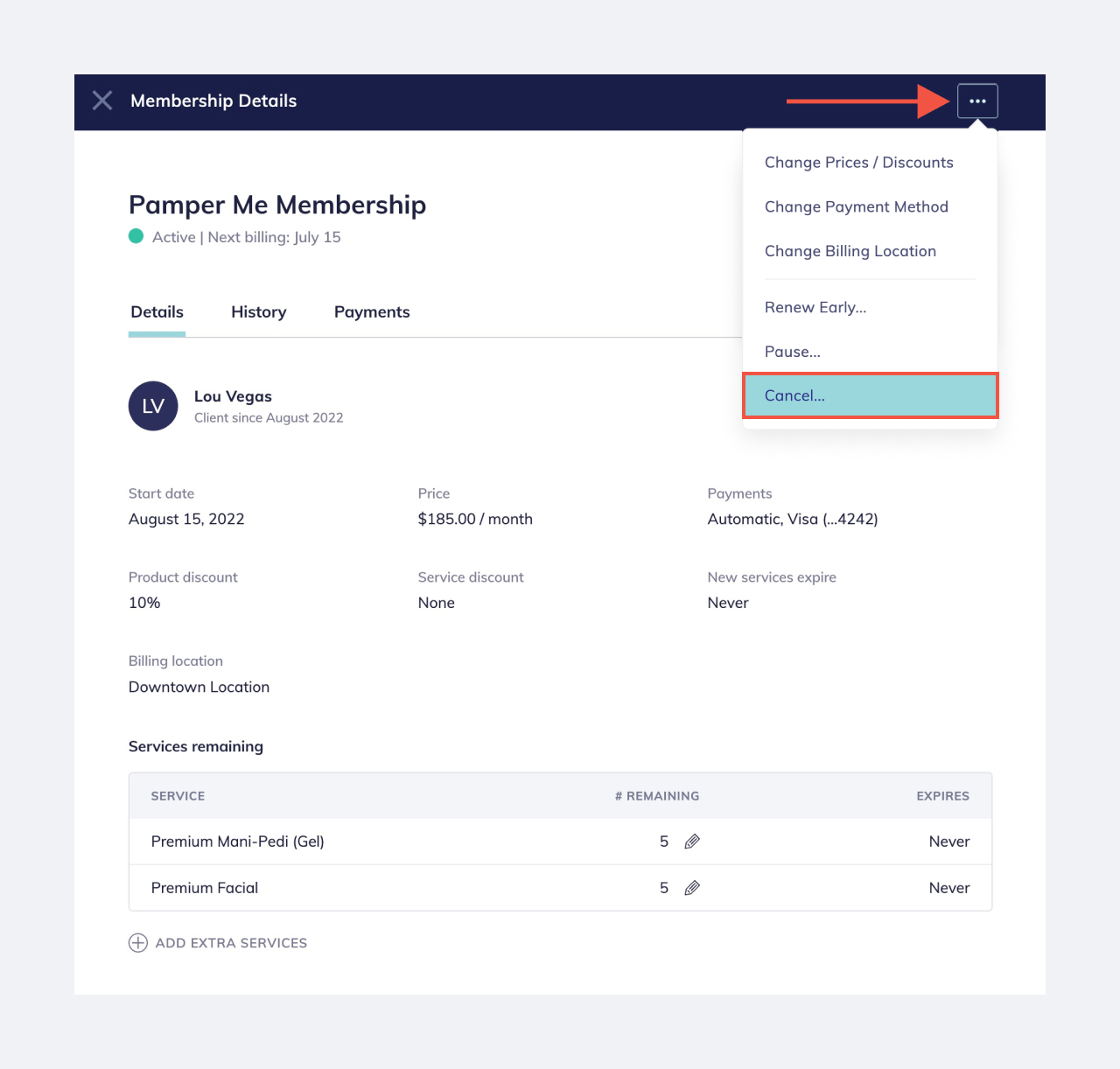In addition to allowing clients to cancel their own memberships through the client portal, you can cancel client memberships when viewing the membership details.