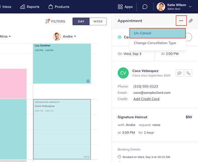 If you canceled an appointment by selecting Normal Cancellation, Late Cancellation, or No Show, you can un-cancel the appointment if needed. If you deleted an appointment by selecting Just delete it, please contact chat support for assistance.