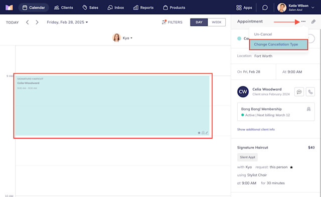 If a client cancels an appointment through the client portal, it is considered a Normal Cancellation, regardless of the time selected for the Late Cancellations setting. If you need to change a Normal Cancellation to a Late Cancellation, select Change Cancellation Type from the "..." menu.