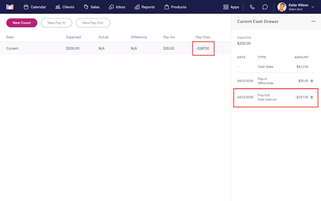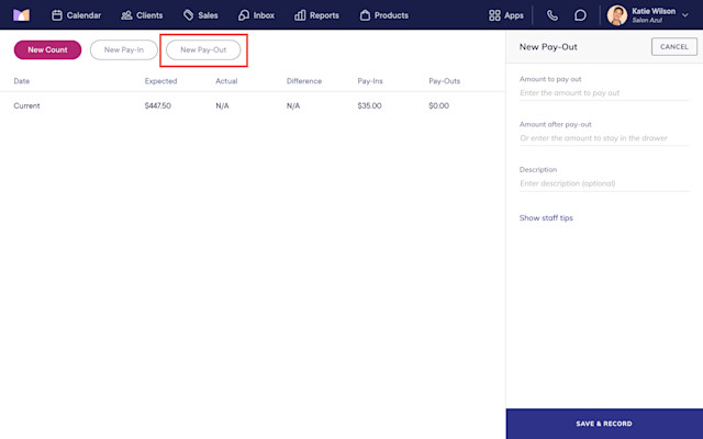 To close out the cash drawer at the end of the day, open the Cash Drawer app and select New Pay-Out.