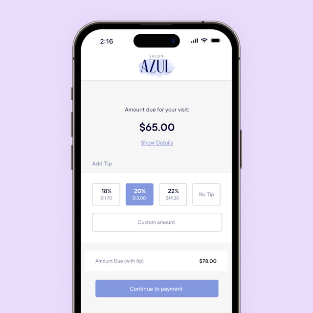 Client Self Checkout allows clients to complete the checkout process directly on their phone. Clients will be sent a text message with a link to add a tip, complete the payment, and view their receipt.