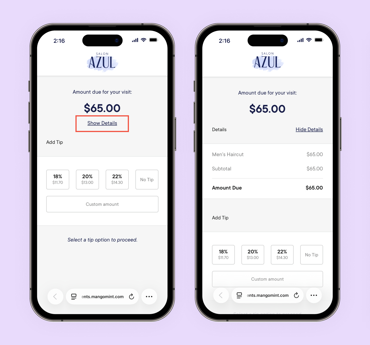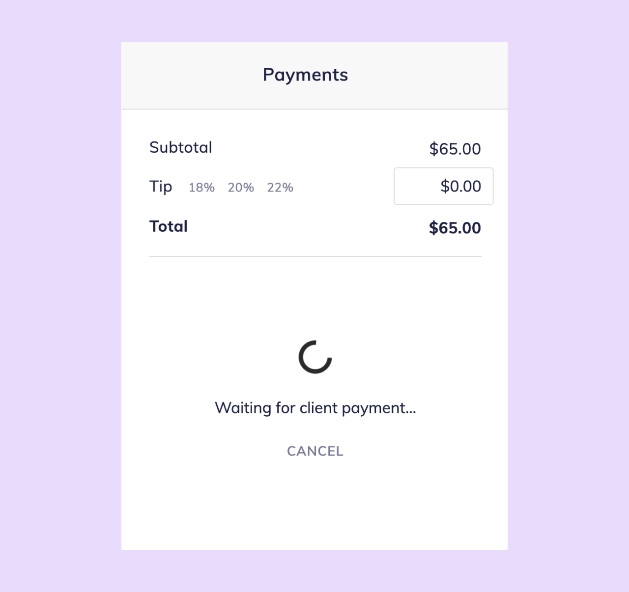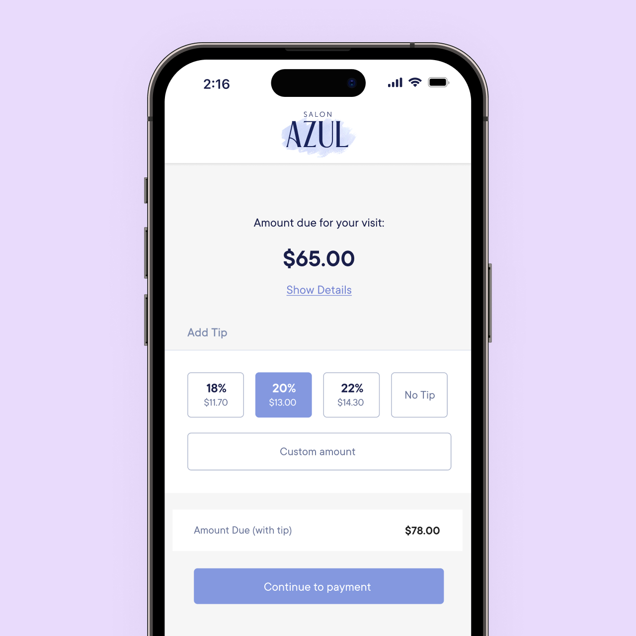 The client will be able to select a tip percentage or enter a custom tip amount before continuing to the payment.