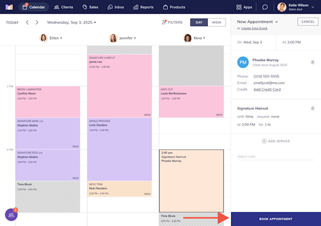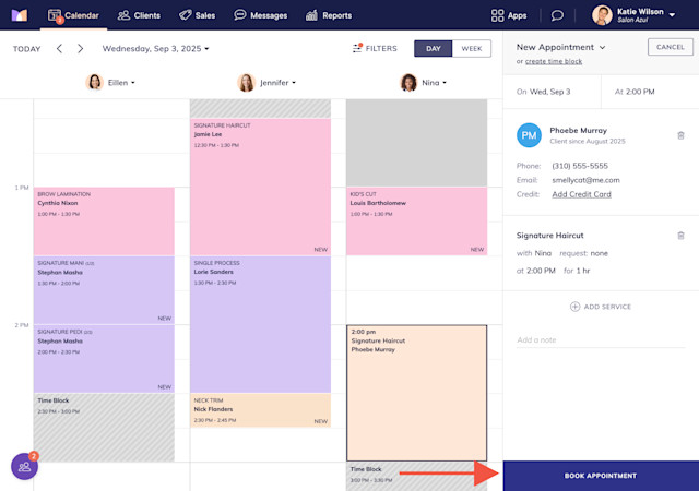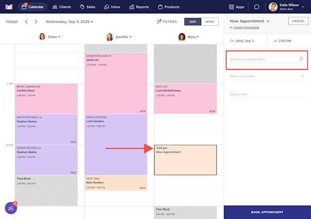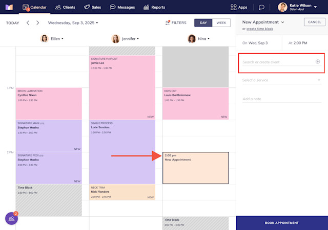 To create an appointment, click anywhere on the calendar to open the appointment details on the right. You can drag and drop the appointment on the calendar to change the appointment time or staff member.