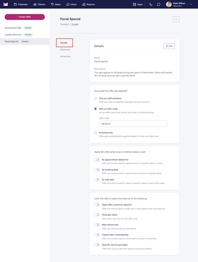 Open the Offers app and select Create Offer. Customize your offer using the Details, Discounts, and Advanced tabs.