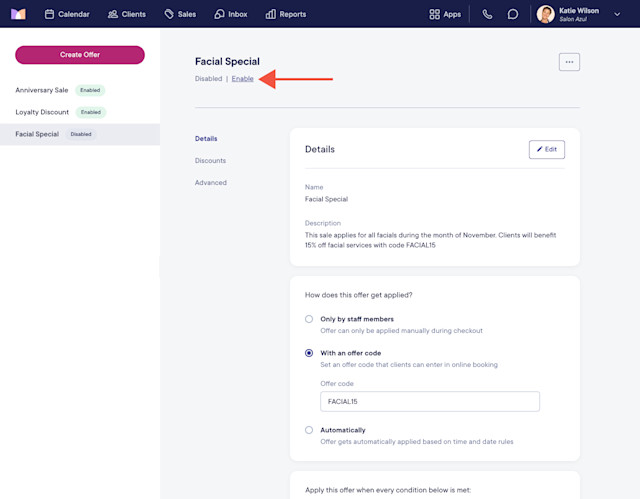 Once you’re finished creating the offer, select Enable to enable the offer.