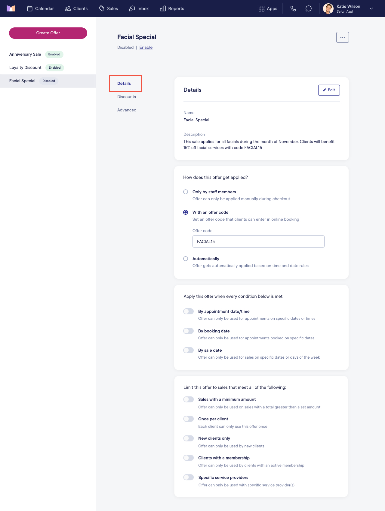 Open the Offers app and select Create Offer. Customize your offer using the Details, Discounts, and Advanced tabs.
