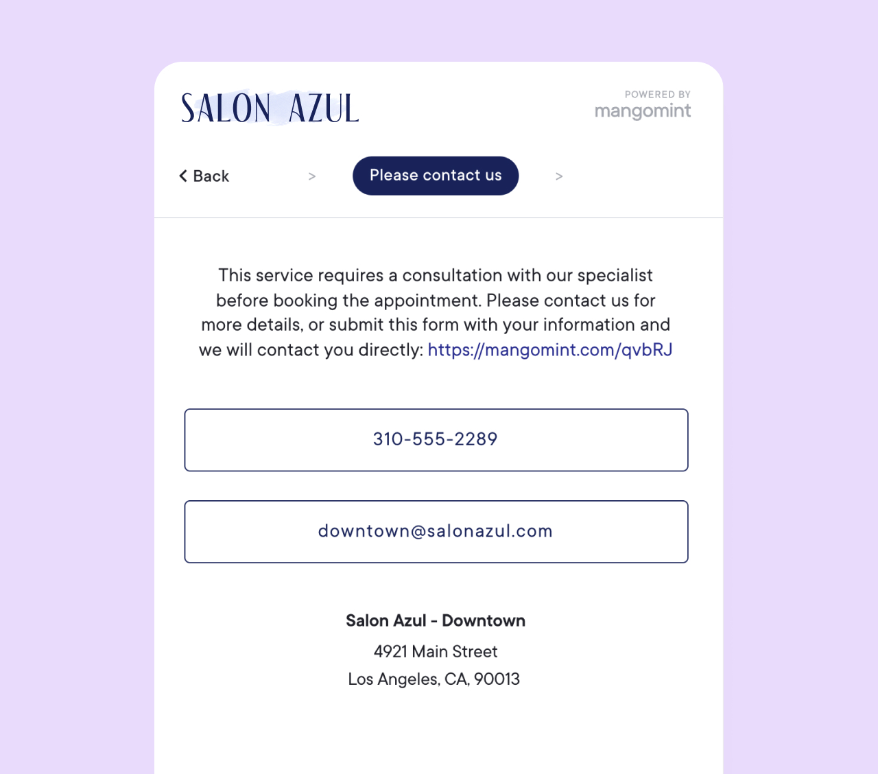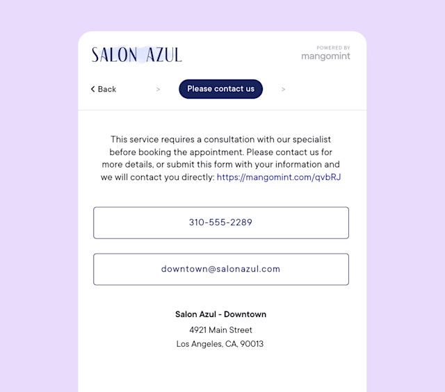 When enabled, clients can see the service in online booking, but they cannot book the service. This is helpful for services that require explanation or services that vary in price/duration. You can enter a Prompt-to-call explanation to explain why the service can't be booked online. You can also provide links in the prompt-to-call explanation, such as a link to an external form.