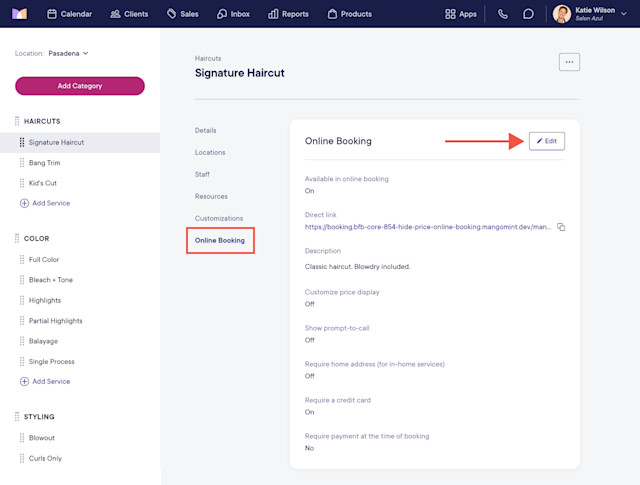After enabling online booking, you can enable services for online booking.