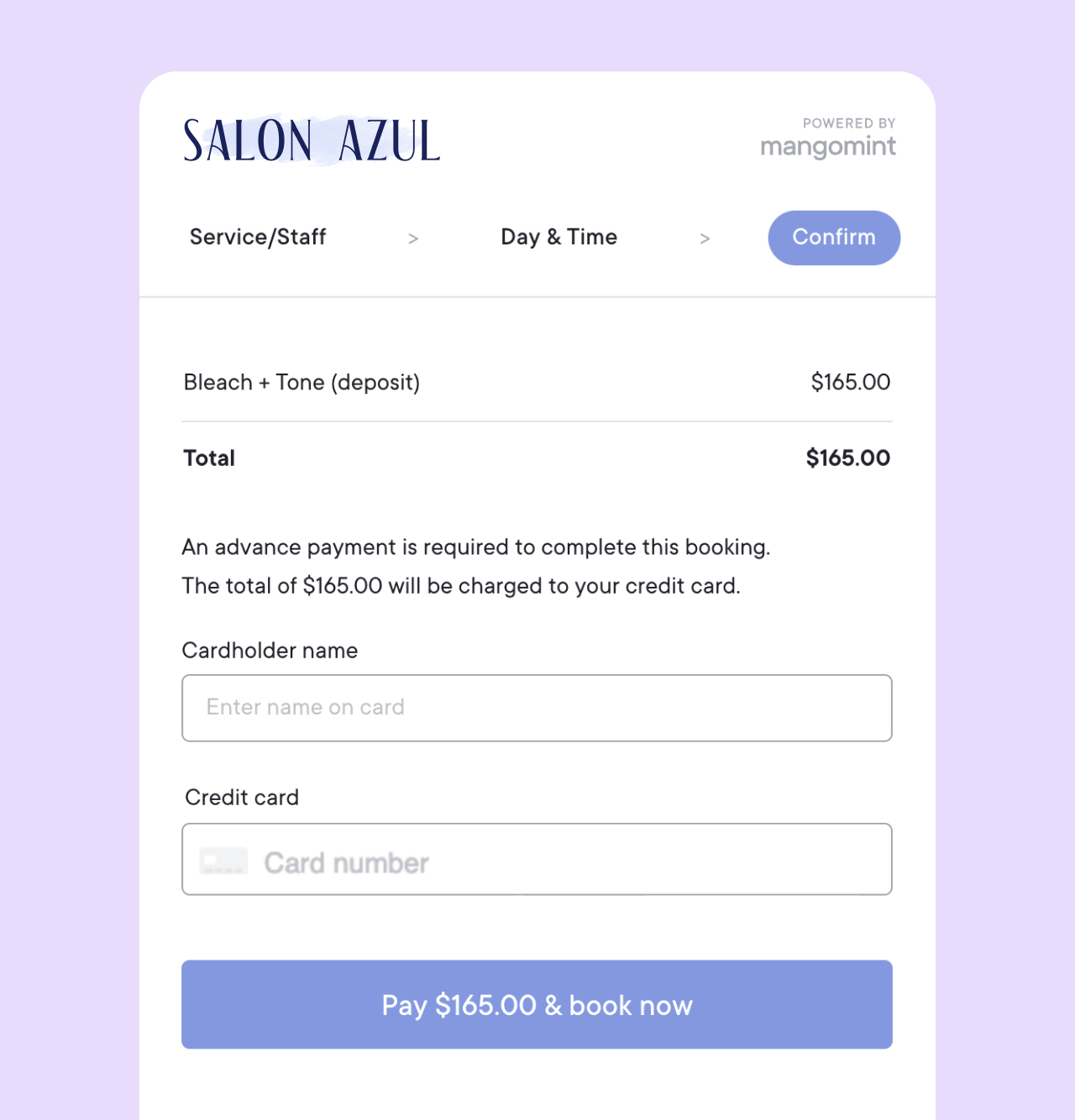 Full payment: The full service price will be charged during online booking.