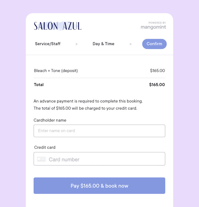 Partial deposit: A fixed amount or percentage of the service price will be charged during online booking.