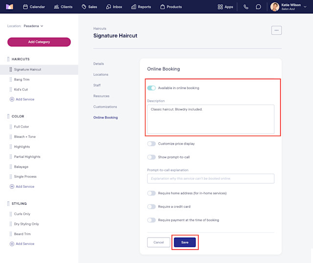 Enable the Available in online booking toggle. You can also enter a service description that will be visible in online booking. Select Save.