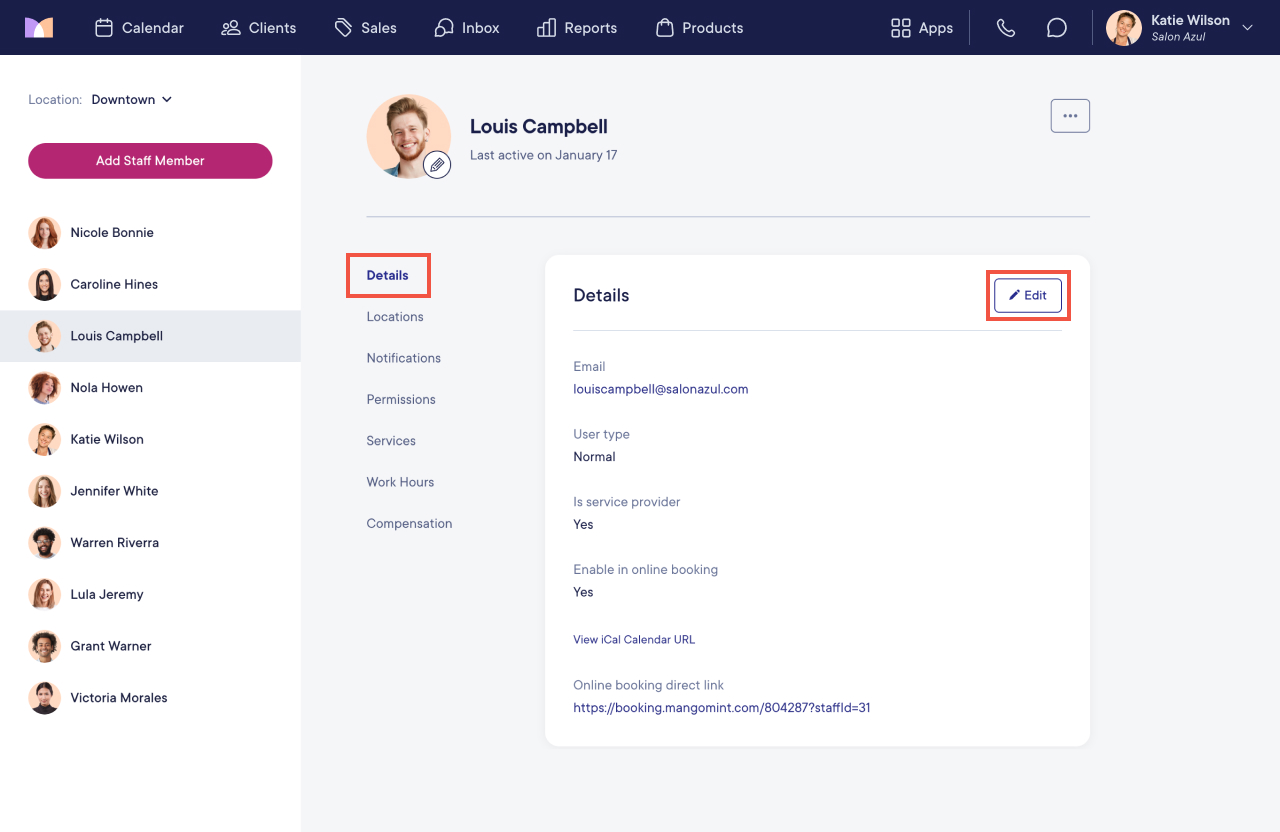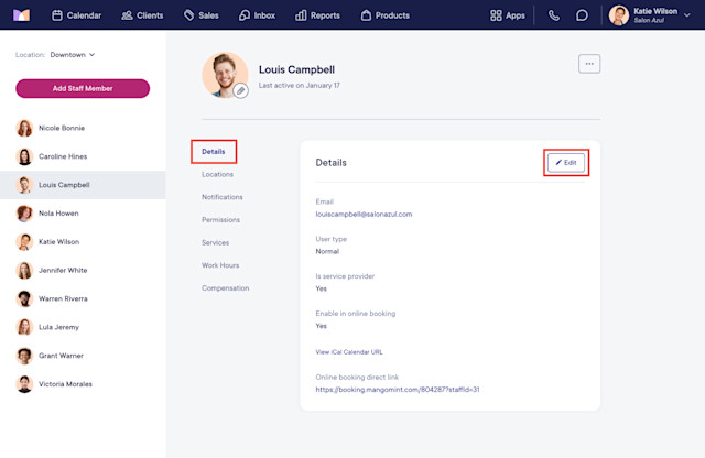To disable the credit card requirement in online booking for specific staff members, open the Staff Members app and select the staff member. Select Edit.