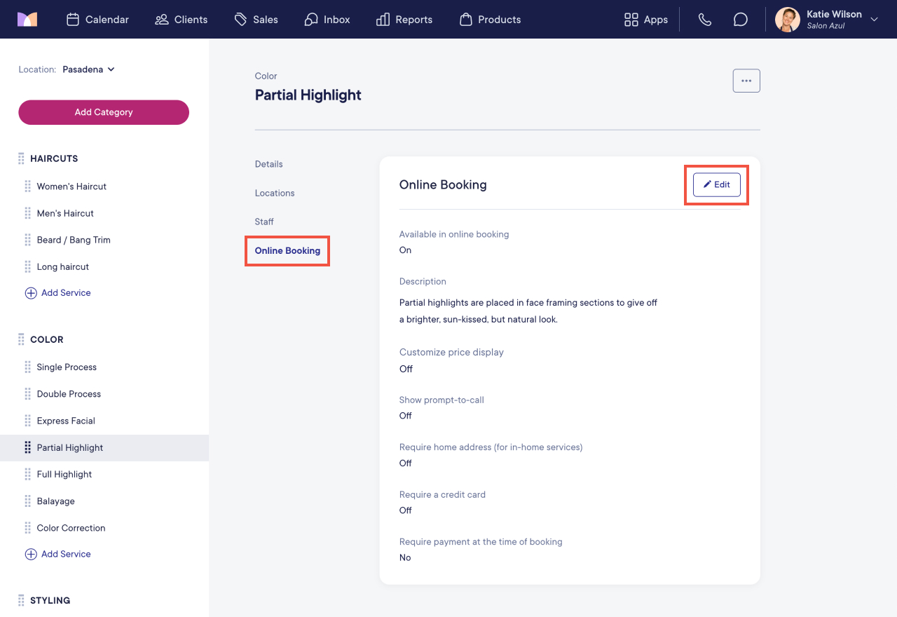 To require a credit card in online booking, open the Services app and select the service.