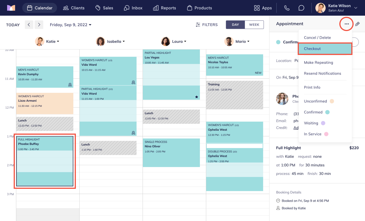 To collect a manual deposit, select the appointment on the calendar. Select Checkout from the "..." menu.