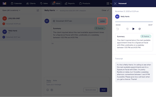 Select Listen to listen to the voicemail and view a full transcript of the voicemail. Transcripts allow you to read the client's entire voicemail message and find key details at a glance.