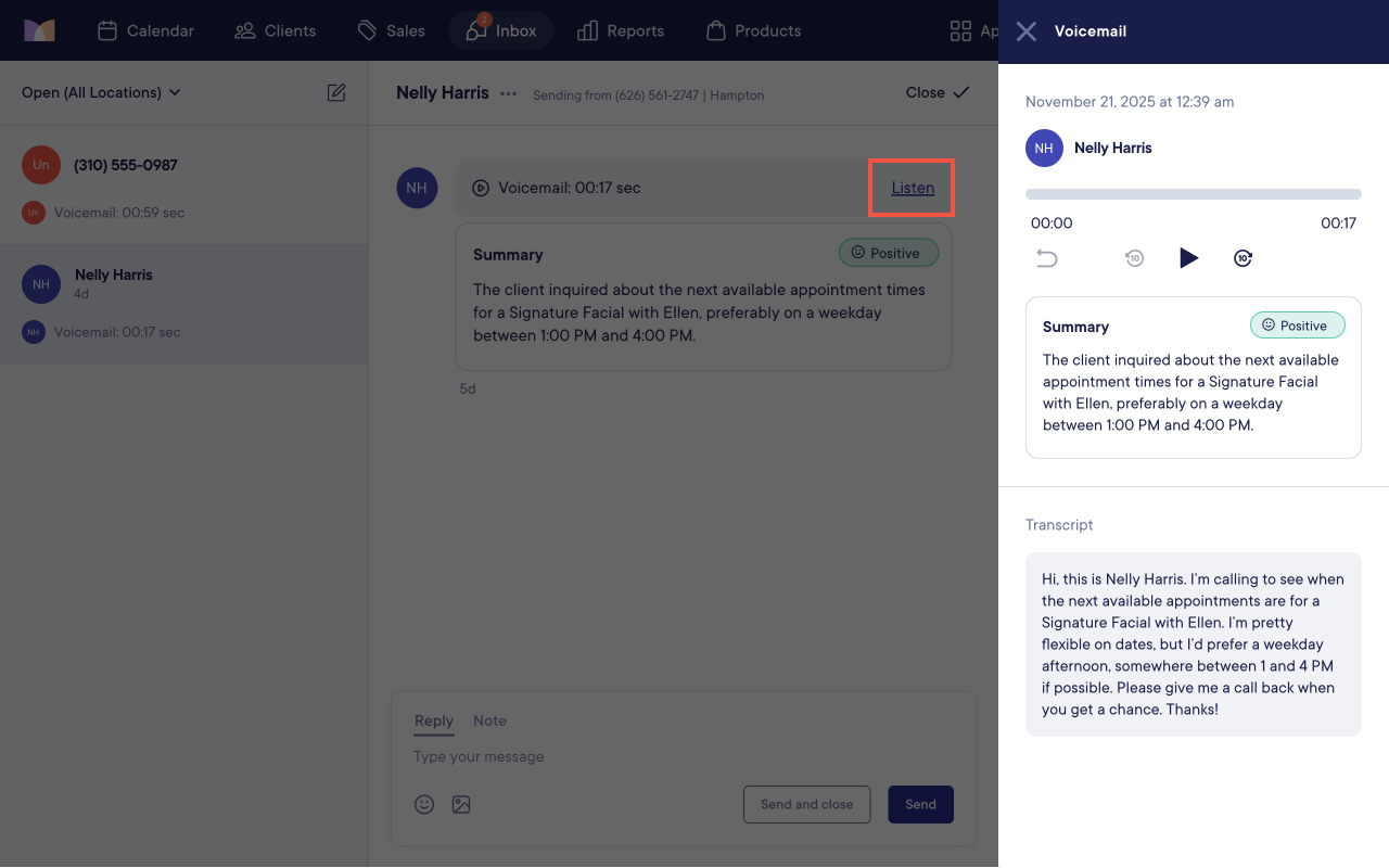 Select Listen to listen to the voicemail and view a full transcript of the voicemail. Transcripts allow you to read the client's entire voicemail message and find key details at a glance.