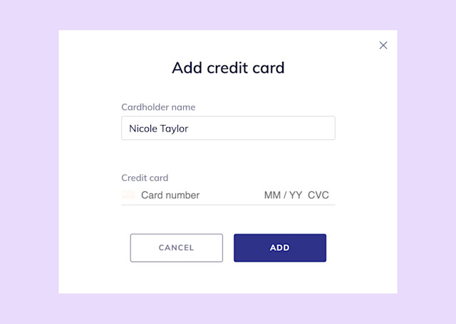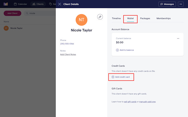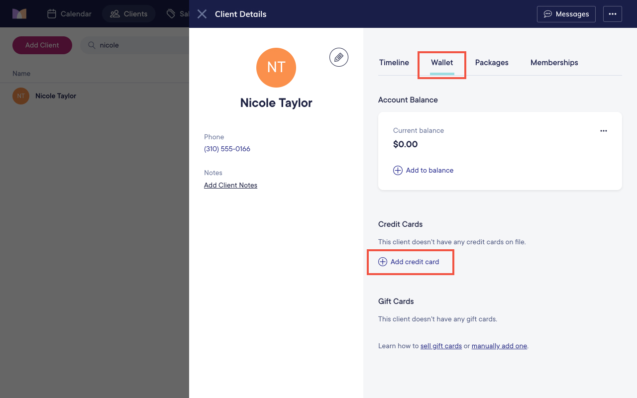 To add a card on file from the client details, select the Wallet tab and select Add credit card.
