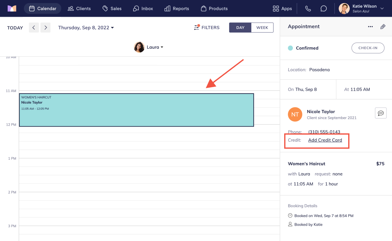 To add a card on file from the calendar, select the appointment and select Add Credit Card.