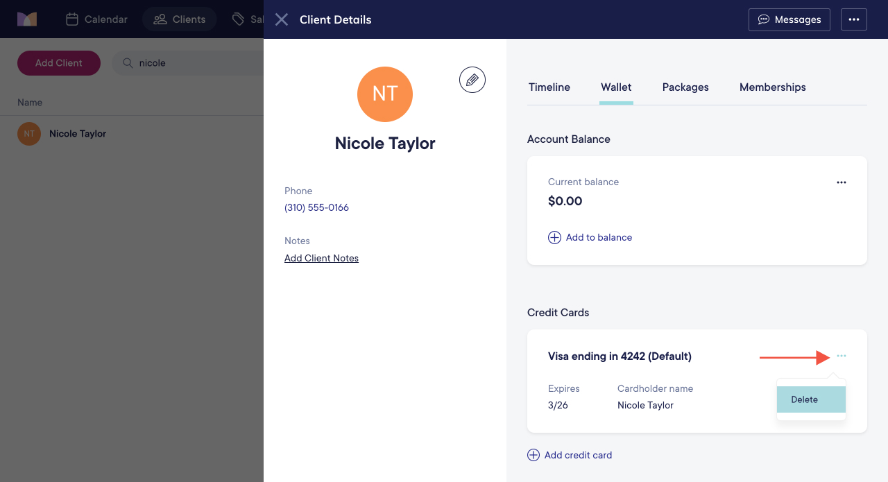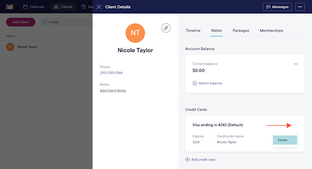 The Wallet tab is also where you can view and manage all the cards on file for a client.