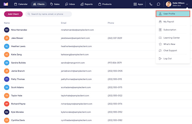 In the Clients app, you can add new clients, search for existing clients, and view client details including contact information and client notes.