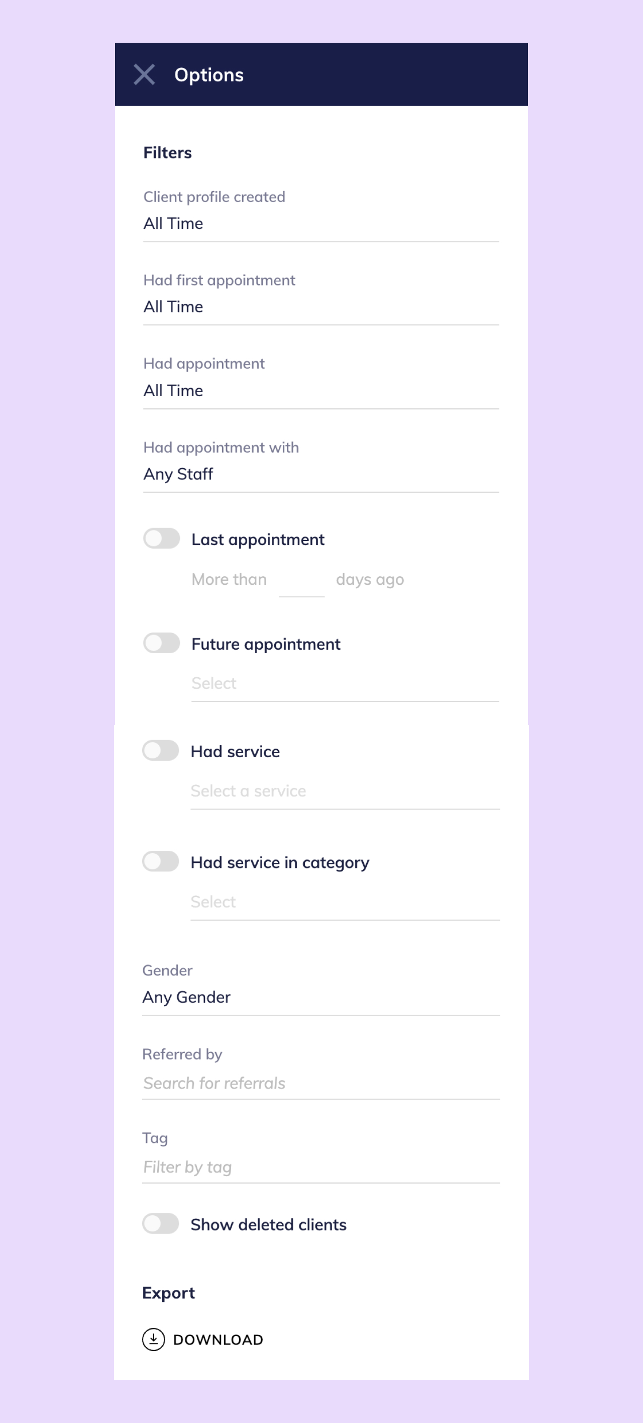 To filter the client list, select Options. Update the filters as needed and select Apply. To reset the filters, select Reset to default filters.