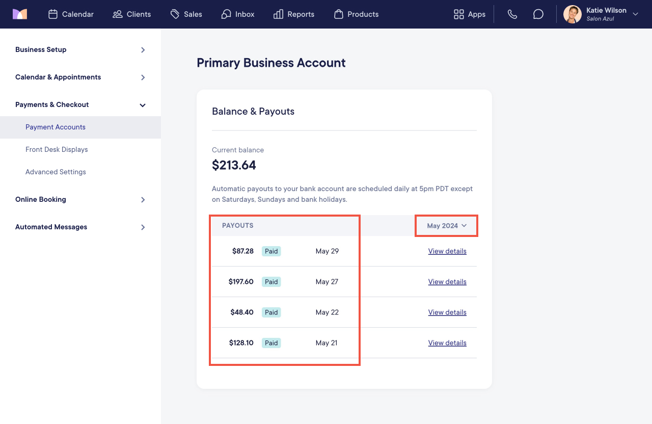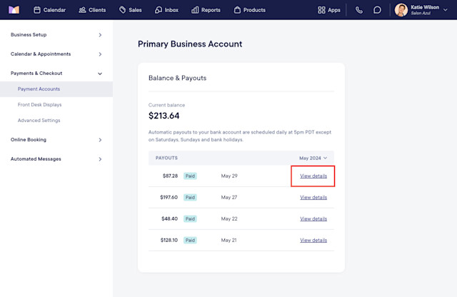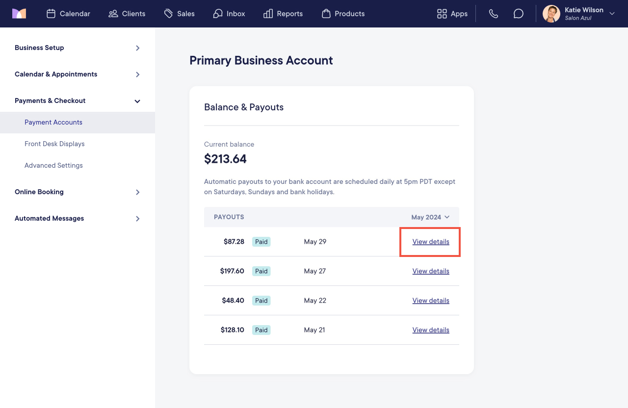 To view transactions and fees, select View details next to a payout.