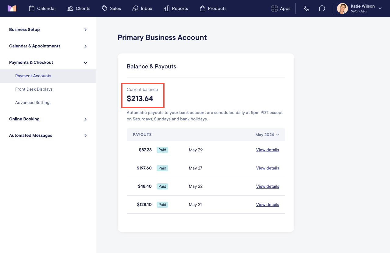To view your current balance and payouts, open the Settings app and select Payments & Checkout > Payment Accounts > Manage account.