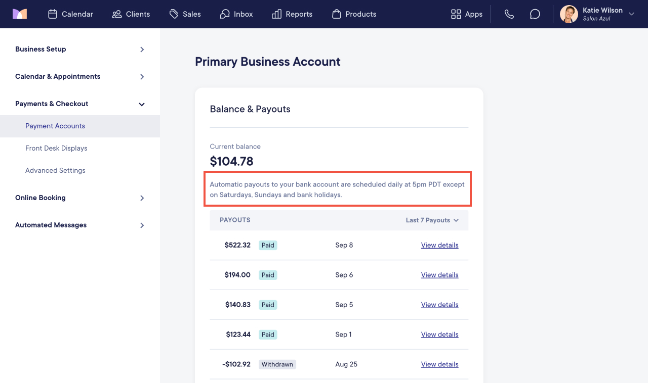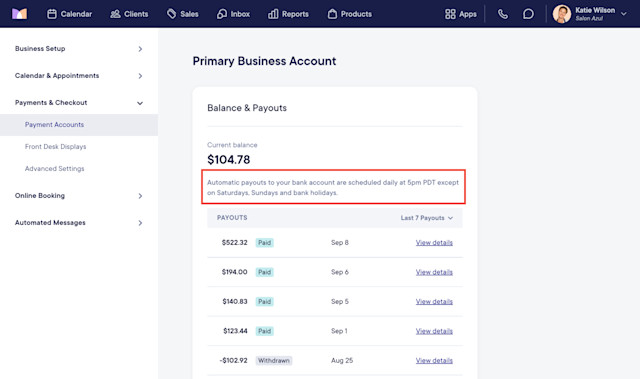 Mangomint's integrated payment processing has next-business-day deposits. There is also a two-day deposit time for transactions that occur before a holiday.