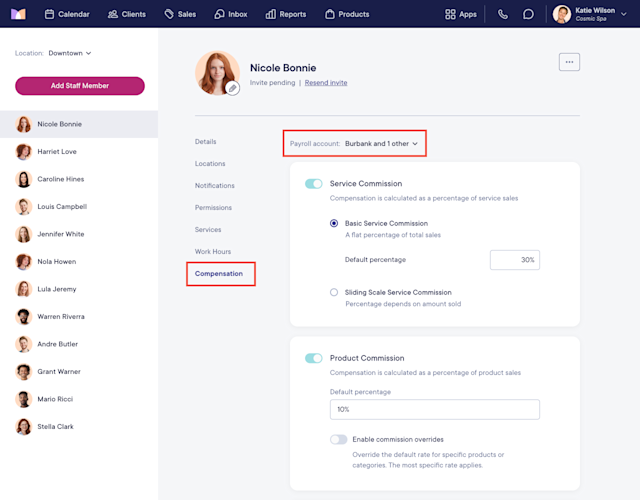 Once each payroll account is signed up for Payroll Processing and completed onboarding, open the Staff Members app and select the Compensation tab. Make sure the correct compensation is set up for any staff members who work at multiple locations assigned to different payroll accounts.