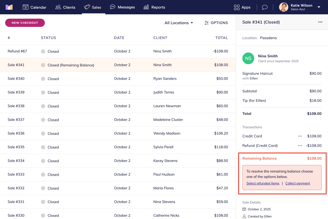 If you chose Collect payment, you can resolve the remaining balance by collecting a new payment for the refunded amount. This is helpful if the client requested a refund so they could use a different payment method.