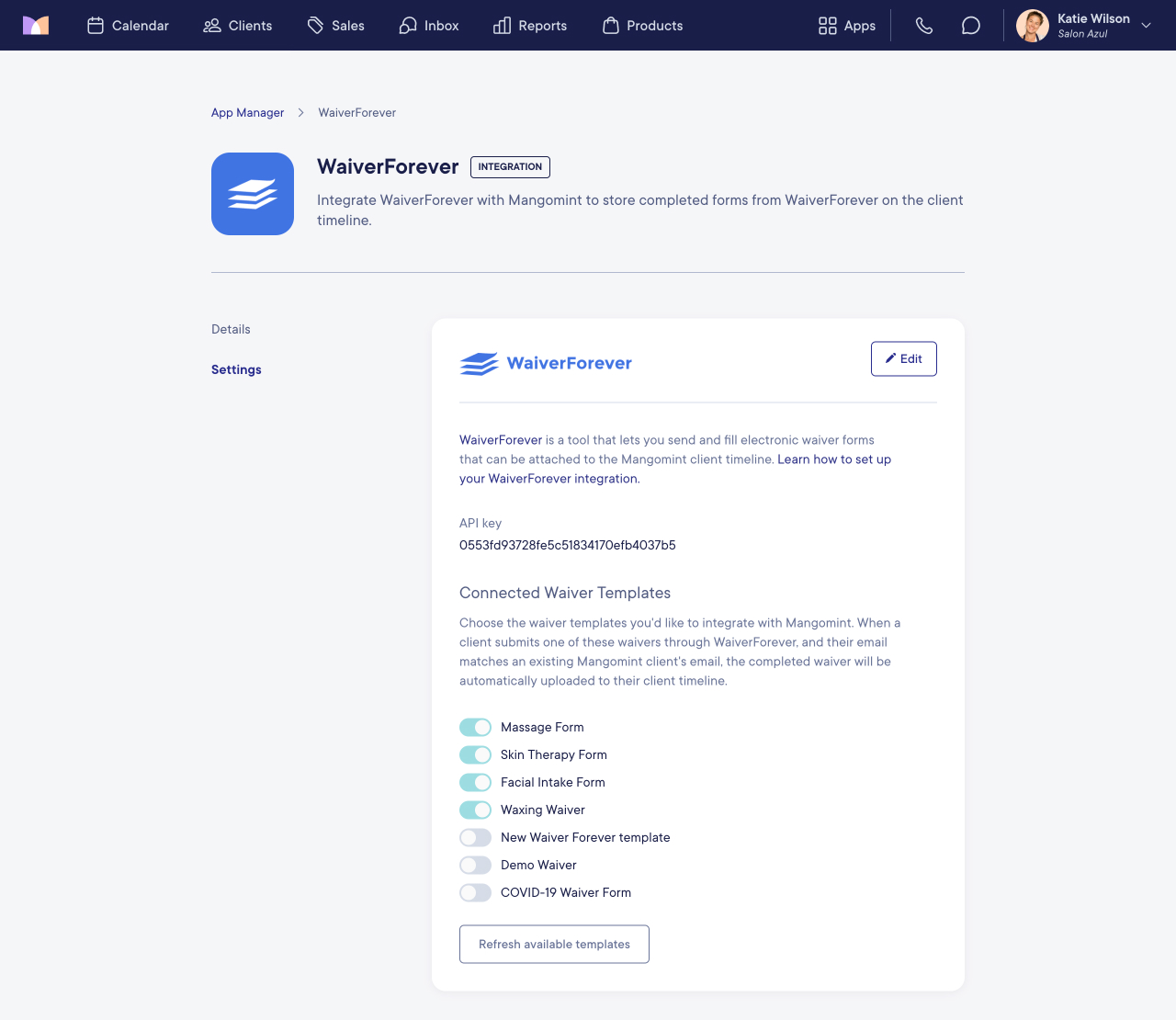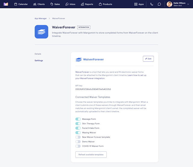 In Mangomint, go to Apps > Manage apps > WaiverForever > Settings and select Edit.