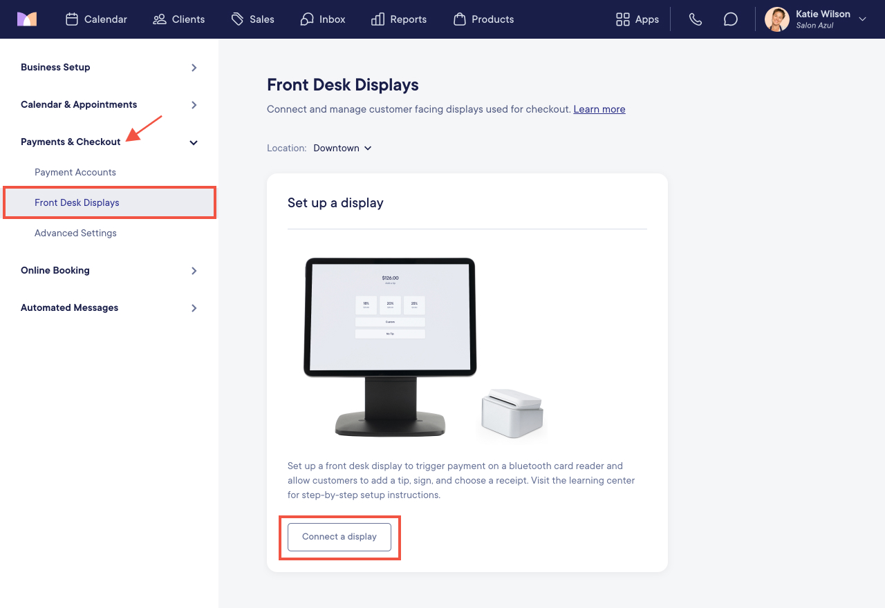 Open the Settings app and select Payments & Checkout > Front Desk Displays.