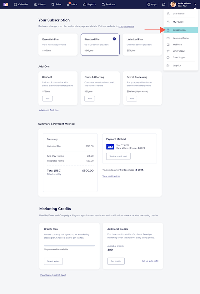To update the credit card you use to pay for your Mangomint subscription, select Subscription from your profile menu.