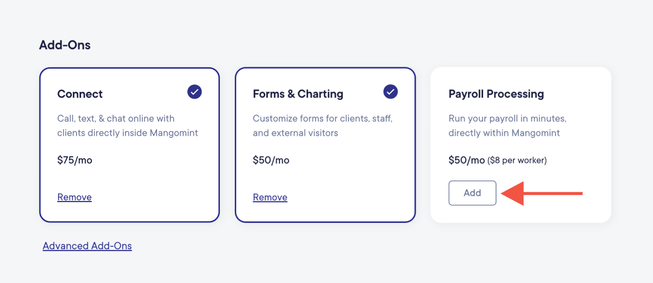For Payroll Processing customers, you can select Change next to the Payroll Processing add-on to change the number of workers on your payroll.