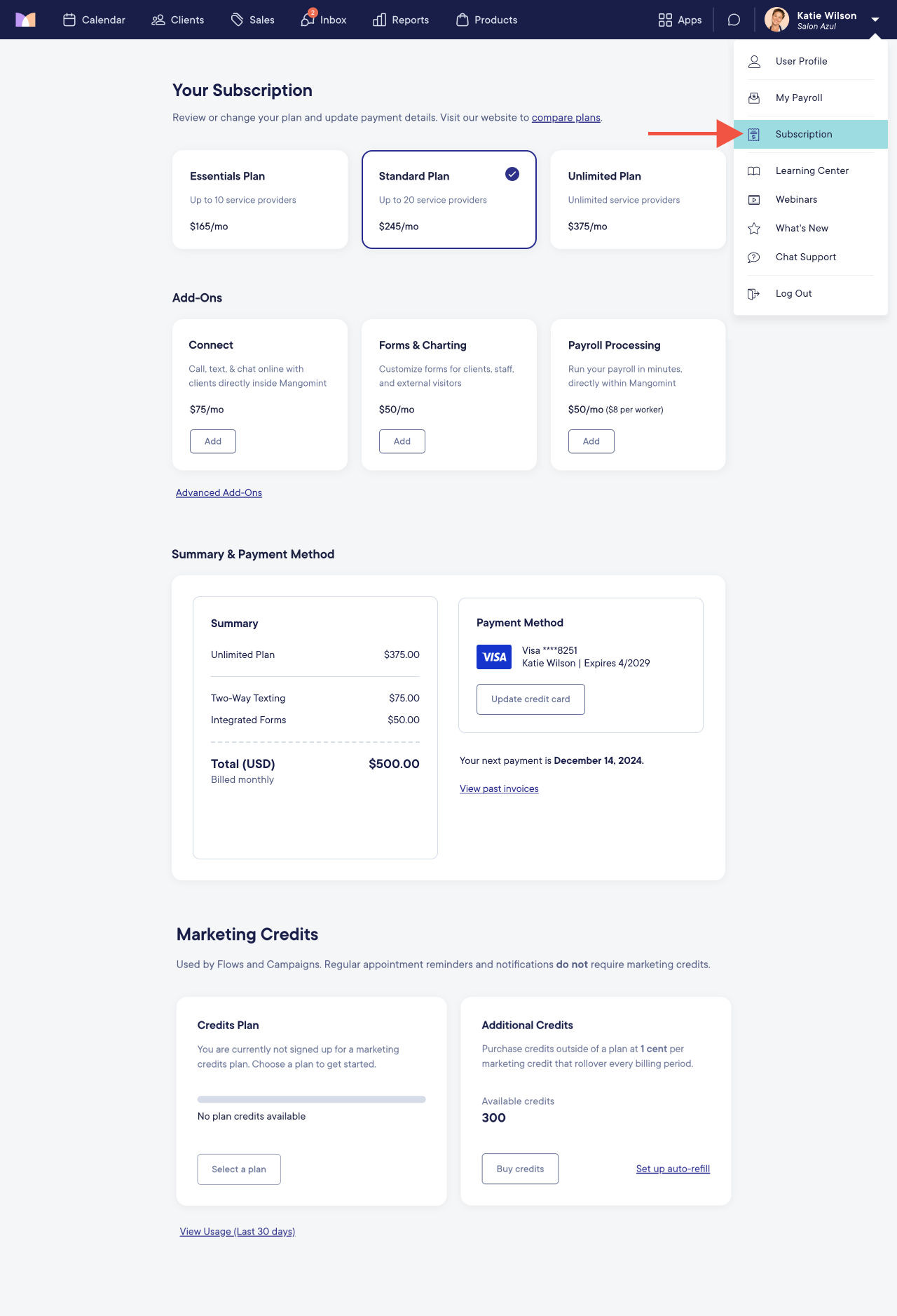 To update the credit card you use to pay for your Mangomint subscription, select Subscription from your profile menu.