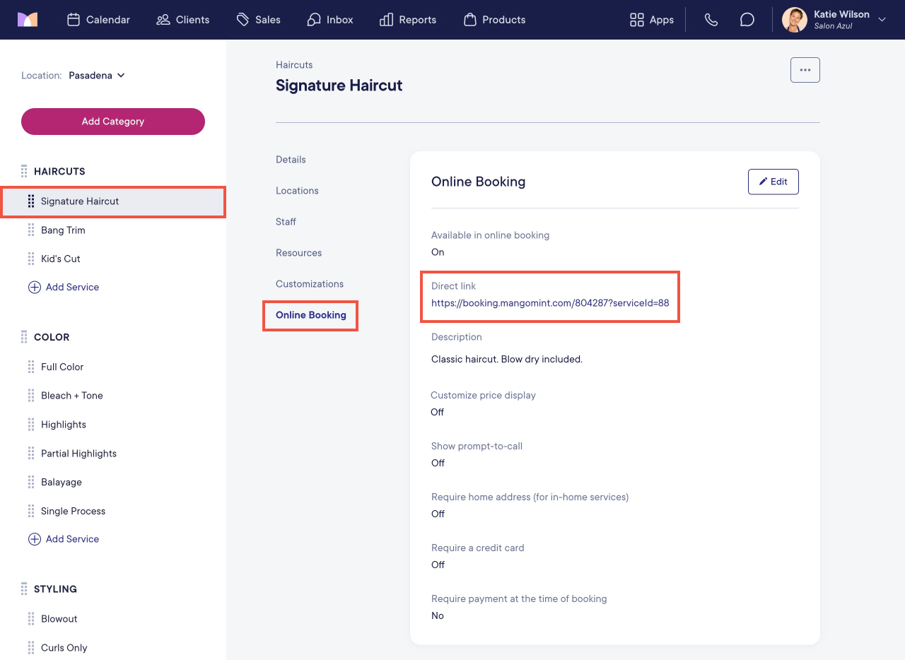 Direct booking links for individual services can be found in Apps > Services > Online Booking.