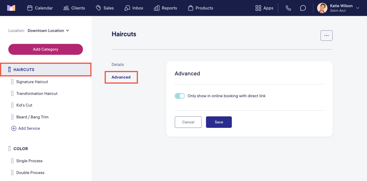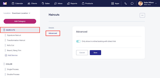 You can also hide entire service categories from online booking. Select the service category name and select the Advanced tab.