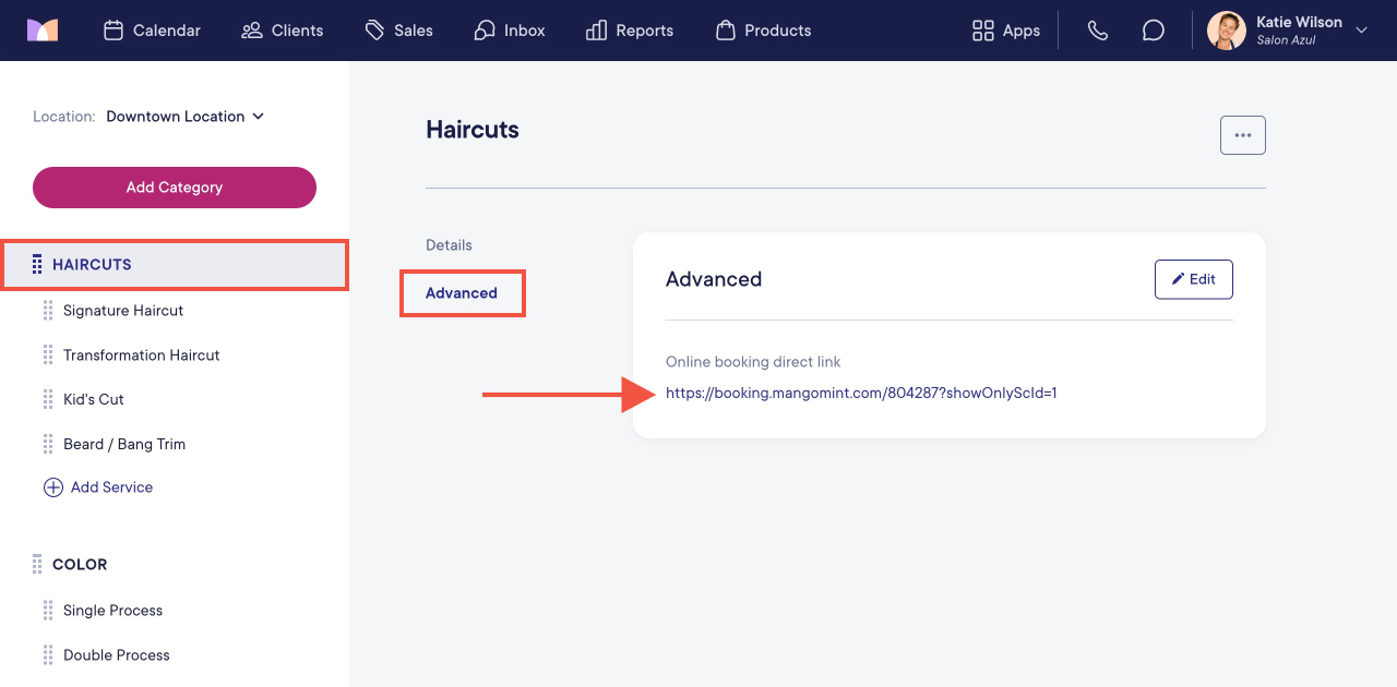 Direct booking links for entire service categories can be found in the Services app. Select the service category name and select the Advanced tab to access the direct booking link.
