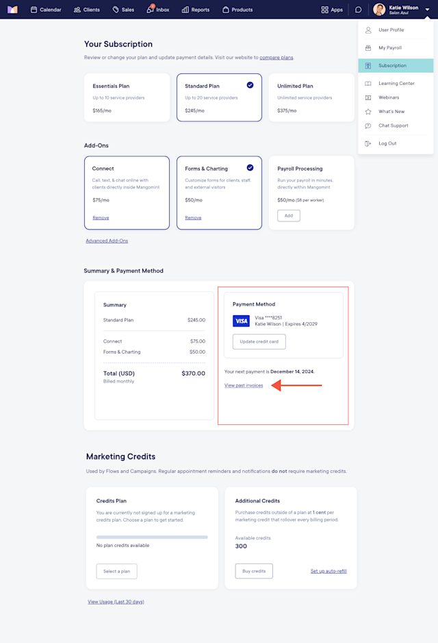 To view the invoices for your Mangomint subscription, select Subscription from your profile menu.