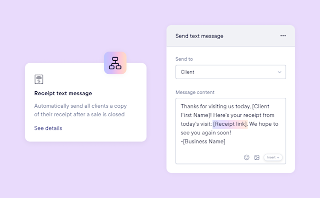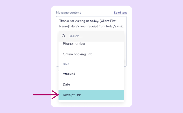 There’s a new merge tag available in the Sale closed trigger called Receipt link. Drop it into your message, and it will automatically include a direct link to the client's receipt.