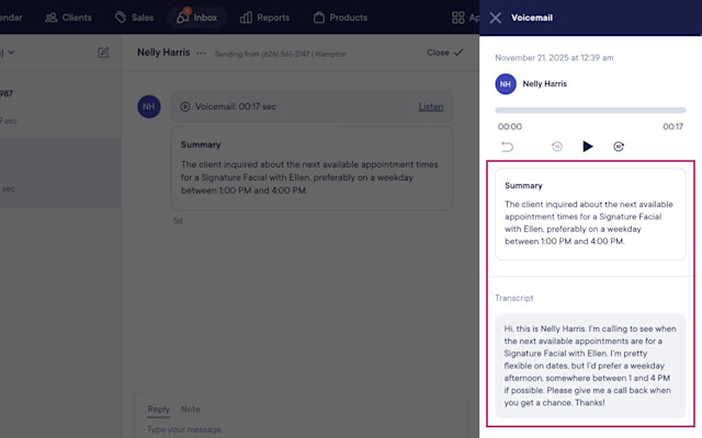 You can now see summaries and full transcripts for voicemails. When a client leaves a voicemail, Mangomint automatically creates a summary right under the voicemail in your Inbox so you can quickly see why they called.